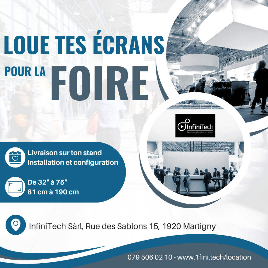 Que vous organisiez une réunion d’entreprise, une projection en plein air, un mariage ou un stand à la Foire du Valais, InfiniTech met à votre disposition des écrans de 81 à 190 cm, disponibles à la location pour toutes les occasions.